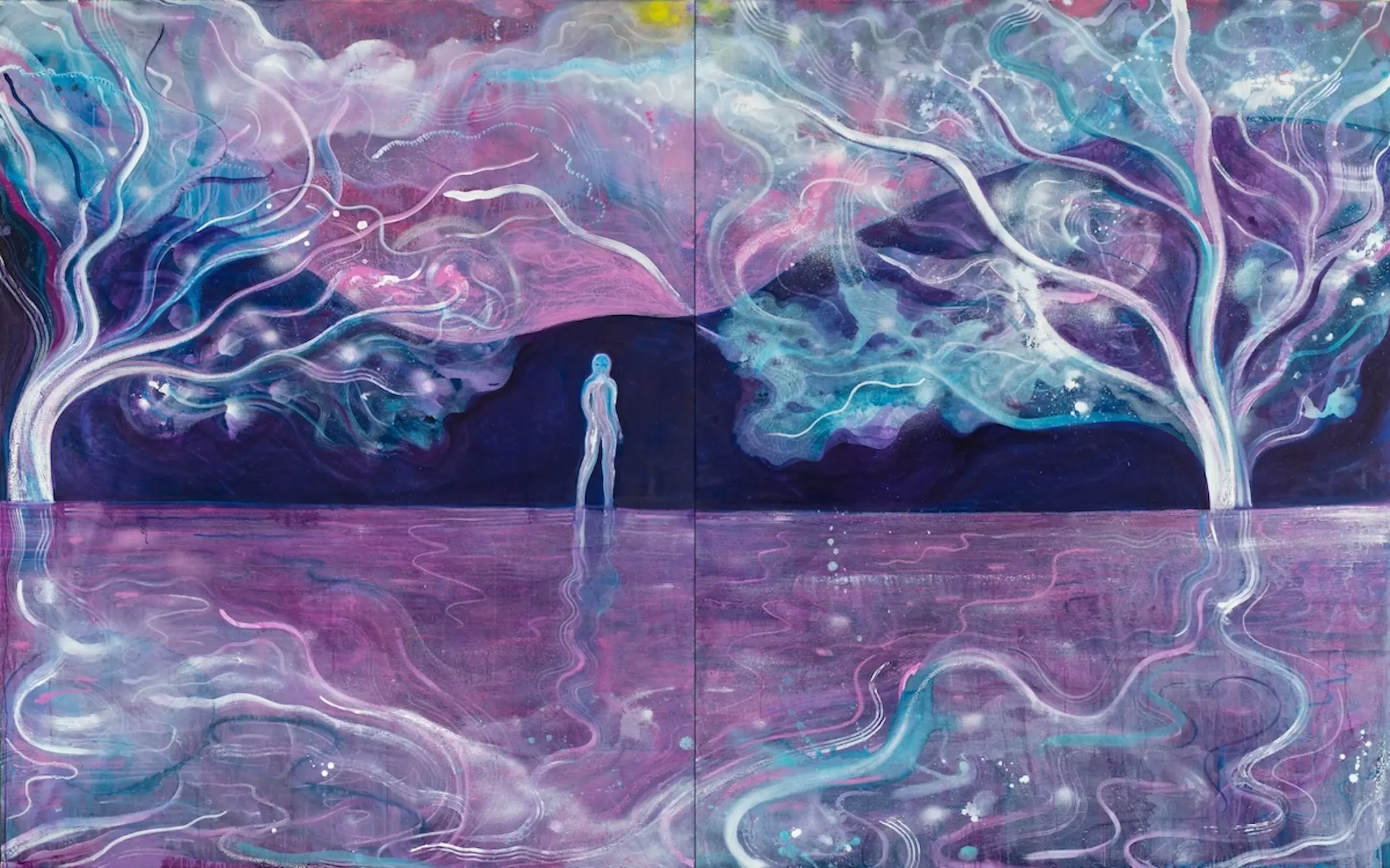 This mutable nature—charged with invisible energies—is mirrored in an organic, gestural language that seeks not to depict form but to evoke states of being. Within this floating world, spectral figures of young girls recur, reminiscent of the emblematic characters of Henry Darger or Marie Laurencin. Androgynous and diaphanous, these silhouettes inhabit a liminal zone—both present and dissolving, suspended in an ontological in-between. As anti-heroines within a non-linear narrative logic, they embody a state of identity-in-formation: fluid, provisional, and open-ended. Inspired by the spectral iconography of Japanese folklore—yūrei(¹) and ikiryō(²)—these apparitions retain a quiet agency: intermediaries or witnesses to an altered reality, their gaze oscillates between wonder and unease.