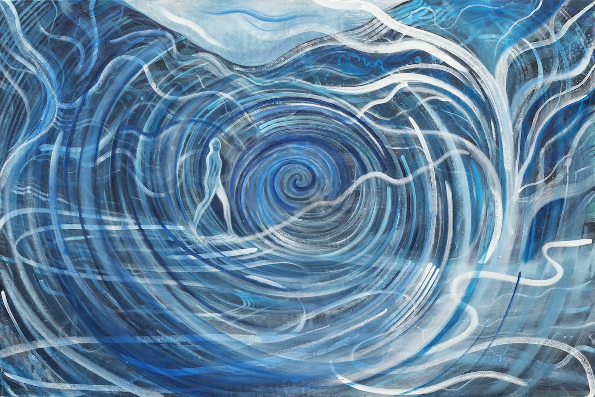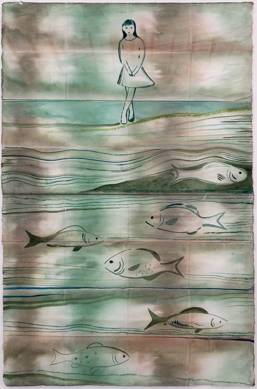Her compositions evoke environments of fluid instability: landscapes in perpetual transformation, animated by the sensation of metamorphosis. Water, a central and structuring element, transcends the role of motif to become a conceptual and spatial force. It shapes the mental architecture of the image, operating as a vehicle of change. Submerged islands, aquatic forests, and dreamlike reefs suggest immersion in a liquefied, amorphous space.This mutable nature—charged with invisible energies—is mirrored in an organic, gestural language that seeks not to depict form but to evoke states of being. Within this floating world, spectral figures of young girls recur, reminiscent of the emblematic characters of Henry Darger or Marie Laurencin. Androgynous and diaphanous, these silhouettes inhabit a liminal zone—both present and dissolving, suspended in an ontological in-between. As anti-heroines within a non-linear narrative logic, they embody a state of identity-in-formation: fluid, provisional, and open-ended. Inspired by the spectral iconography of Japanese folklore—yūrei(¹) and ikiryō(²)—these apparitions retain a quiet agency: intermediaries or witnesses to an altered reality, their gaze oscillates between wonder and unease.